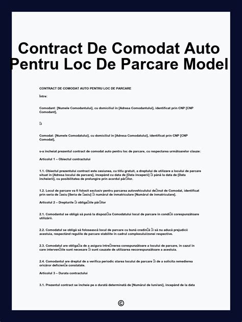 Contractul de comodat auto pentru loc de parcare este un acord între două părți, prin care proprietarul unui loc de parcare îl pune la dispoziția altei persoane, denumită comodatar, pentru o perioadă de timp determinată și fără plată. Acest tip de contract este util în special pentru persoanele care nu au un loc de parcare propriu sau care doresc să își parcheze mașina într-o zonă mai sigură sau mai aproape de domiciliu sau locul de muncă.