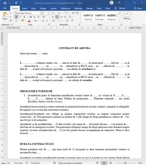 - Drepturile și obligațiile arendatorului și arendașului: care sunt drepturile și obligațiile fiecărei părți în timpul duratei contractului.
