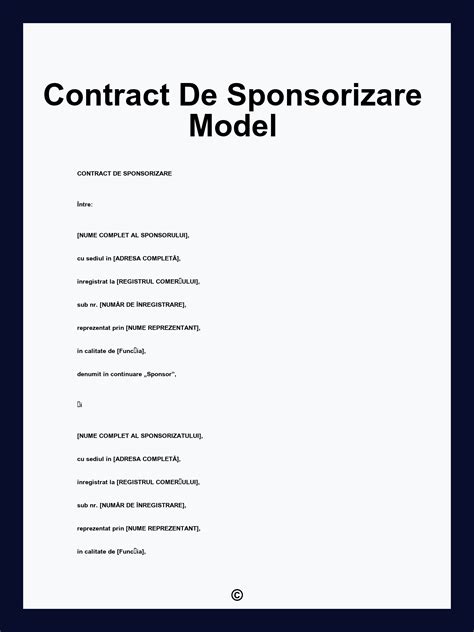 Un model contract de sponsorizare simplu este important pentru a te asigura că întreaga sponsorizare este desfășurată corect și în conformitate cu legile aplicabile. Folosește acest model pentru a elabora un contract de sponsorizare care să fie echitabil și avantajos pentru ambele părți.