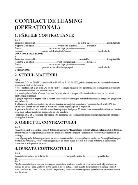 Contractul de leasing este un contract real prin care o parte, numită locator, transmite în mod gratuit folosința unui bun mobil sau imobil celeilalte părți, numită locatar, pe o perioadă determinată, în schimbul unei chirii. Locatarul este obligat să plătească chiria convenită și să restituie bunul locatorului la sfârșitul perioadei de leasing.